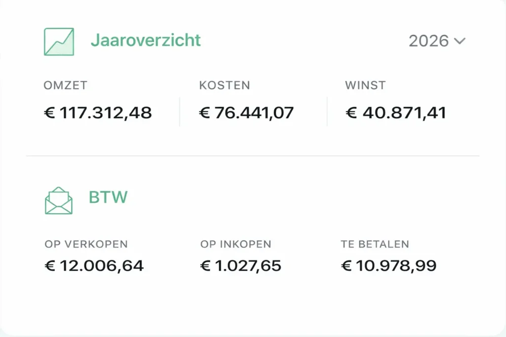 Via de mobiele app en webomgeving heb je altijd en overal realtime inzicht in je administratie. Al je facturen en zakelijke banktransacties staan overzichtelijk bij elkaar. Je omzet, kosten, winst en te betalen btw worden automatisch voor je berekend.